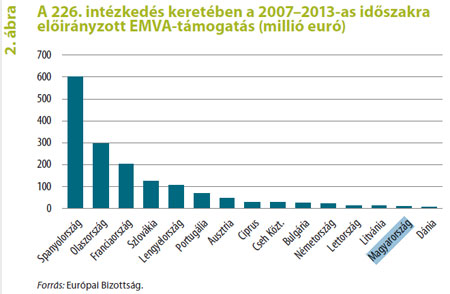 Itt láthatóan Magyarország esetében a tervezett 8.251 Euróval szemben csak 1.084 Euróra sikerült az EMVA támogatott kifizetés a 2007-2013. időszak új pályázatit illetően. Persze sok más országnál is alacsony a teljesítési arány, miközben van melyeknél igen jó, pl. Szlovákia kerekítve 88 ezer Euróból 90 ezer Eurót hívott le! A két legnagyobb kifizetési tétel Spanyolországé és Olaszországé, melyeket Szlovákia követ. Úgy tűnik, ebben északi szomszédunktól lenne mit tanulnunk.
