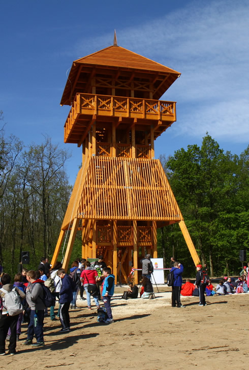 A vasi szoknyás haranglábakat idéző architektúrájú, faszerkezetű kilátó megépítése fontos része a 7200 hektáros erdőségben 2014-ben megvalósított közjóléti fejlesztéseknek. A kilátót április 22-én, a Föld Napján adták át ünnepélyes keretek között.