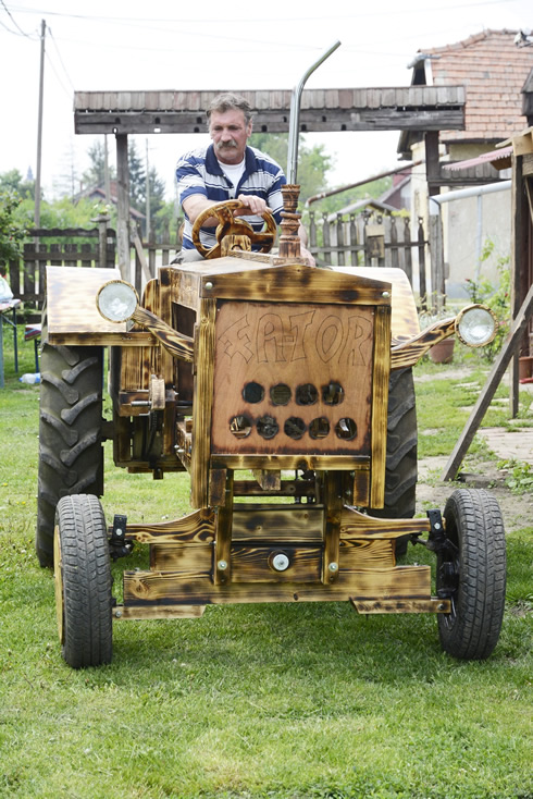 Puskás István, aki motorkerékpárt és autót is készített már fából, most traktort és ekét készített hajópadlóból 4 hónap alatt. Az abroncsok, a lámpák és a motor kivételével a 200 cm2-es fűkaszamotorral hajtott traktor minden eleme fából készült.