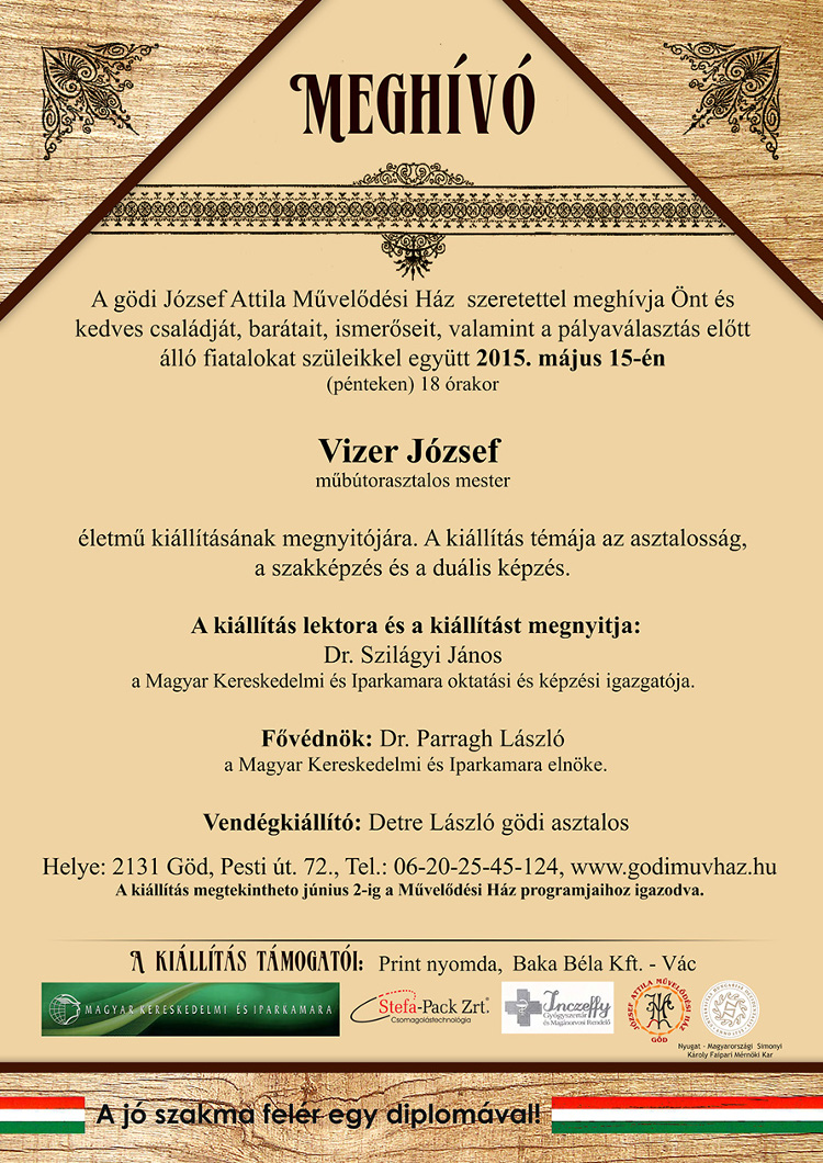 A gödi József Attila Művelődési Ház szeretettel meghívja Önt és kedves családját, barátait, ismerőseit, valamint a pályaválasztás előtt álló fiatalokat szüleikkel együtt Vizer József műbútorasztalos mester életmű kiállításának megnyitójára.