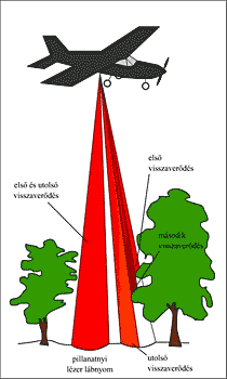 A LIDAR technológia egyik leghatékonyabb felhasználási területe az erdőterületek térképezése, mivel az impulzusok egy része a lombkoronáról egy része pedig a lombkoronán áthaladva a talajról verődik vissza (3. ábra), mely lehetőséget teremt a növényzet és s domborzat együttes térképezésére. A lézeres adatokból erdős területre olyan modellek generálhatók, melyek alkalmasak a vegetáció bizonyos vertikális szintjeinek elkülönítésére is. A légi lézerszkennelésből származó pontfelhőből nagyon pontos digitális felszín és domborzatmodellek (DSM, DTM) számíthatóak (4. ábra). Egy DTM előállítása az első, közbenső és/vagy utolsó visszaverődések azon pontjainak szisztematikus eltávolításával történik, amelyek a talajt borító vegetációról, vagy mesterséges objektumokról verődtek vissza, így megkaphatjuk a terület növényzettel borított felszínmodelljét és a növényzet nélküli csupasz domborzat modelljét is.