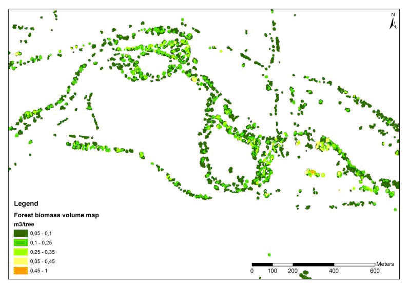 Ezek mellet a fák magassága is meghatározható, lombkoronájuk nagysága is mérhető, továbbá a korona sűrűsége és levélterület meghatározása is lehetséges, így a biomassza-potenciál is becsülhető (vagyis, hogy adott terülten hány m3 élőfakészlet található) idősoros méréssekkel pedig a növényzet növekedése, változása is követhetővé válik (5. ábra). Az idősoros felvétel alapú vizsgálatok esetében az észlelt változásokat a változás mértéke alapján hirtelen, nagy mértékű (pl. erdőtűz) és kis mértékű változással jelentkező folyamatok (pl. az éves szukcesszió) is elemezhetők. (Fa magasság; Korona méret; Vertikális korona profil; Borítás; Biomassza (m3); Korona sűrűség.)