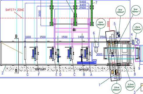 A gép jellemzői: Spaciálisan kialakított két oldali fogazattal ellátott fűrészlapok segítségével a berendezés oda-vissza futás közben is vág. Ezzel lényegesen megnövelve a vágáskapacítást. A különálló vezérlőpultről a V130 vezérlő program segítségével automatikusan irányítható a berendezés. Ezáltal a gépkezelő, vágás közben a vágott darabokat elhelyezheti a rakatokban. Ezáltal elég egy kezelő a berendezés működtetéséhez és az alapanyag elszedéséhez / betárazásához. A különleges megfogó körmök biztosítják a megfelelő gerenda rögzítését és a maximálisan kinyerhető lamella terméket. A gép erősített űrészlapmegvezetéssel rendelkezik, ami elengedhetetlen a pontos méretű és minőségi vágási felületű késztermék készítéséhez.