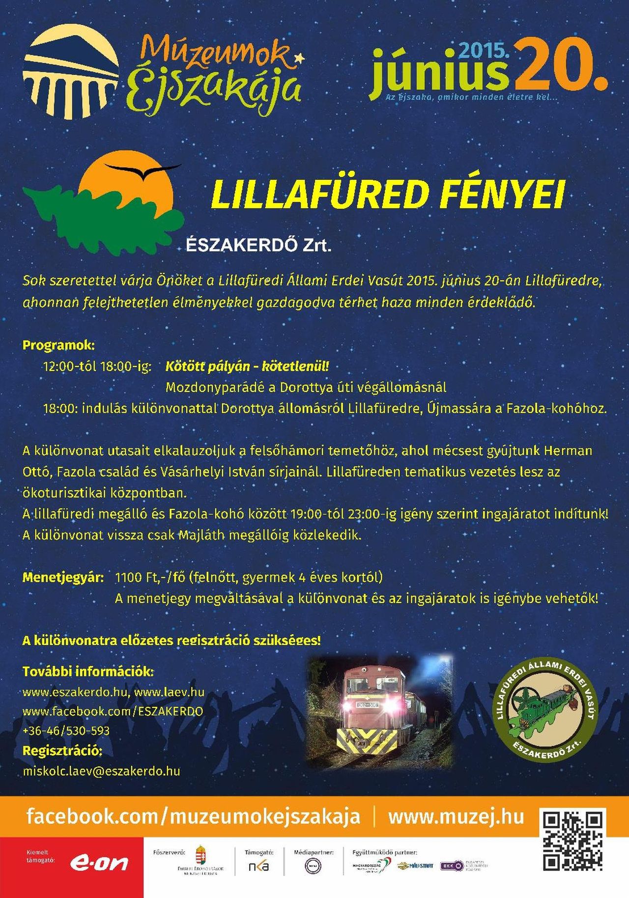 A programok már délben elkezdődnek: "Kötött pályán - kötetlenül" címmel mozdonyparádé lesz a Dorottya úti végállomásnál. A különvonat este 6 órakor indul Lillafüredre, Újmassára a Fazola kohóhoz. Az utasokat elkalauzoljuk a felsőhámori temetőhöz, ahol mécsest gyújtunk Herman Ottó, a Fazola-család és Vásárhelyi István sírjánál. Lillafüreden tematikus vezetés lesz az Ökoturisztikai Központban. A lillafüredi megálló és a Fazola kohó között este 7 és 11 között - igény szerint - ingajáratot indítunk, a különvonat vissza csak Majláth megállóig közlekedik. A különvonatra előzetes regisztráció szükséges.