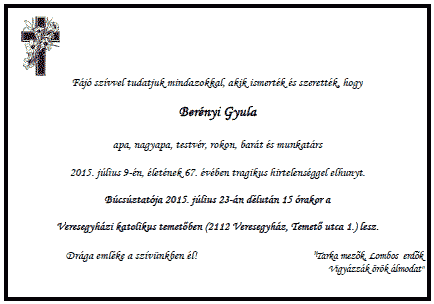 1948. június 22-én született Budapesten és 1966-ban kezdett dolgozni az Erdészeti Tudományos Intézetben. Erdésztechnikusként aktív részese volt az erdővédelmi kutatásoknak, majd az erdősítési technológiai kutatási feladatokkal foglalkozott és részt vett az országos vadkárfelmérésben is. Meghatározó szerepe volt a közönséges dió erdészeti hasznosításával kapcsolatos kutatásokban. A Pécsi Janus Pannonius Tudományegyetemen humánszervező diplomát szerzett. 1982. és 1997. között az ERTI személyügyi és igazgatási vezetője volt. Ezt követően két éven keresztül a Munkaügyi Minisztérium közmunka tanácsának állományában szervezte és irányította az országos erdészeti közmunka programot. 1999-től, három éven a Budapesti Műszaki és Gazdaságtudományi Egyetem Rektori Hivatalának Titkársági Osztályát vezette. 2002-ben visszatért szeretett munkahelyére, az Erdészeti Tudományos Intézetbe, ahol 2010-ig, nyugdíjba vonulásáig az intézet titkárságvezetői munkakörét töltötte be. 2014. május 8-tól az Erdészeti és Faipari Dolgozók Szakszervezetének főtitkárává választották meg. Munkáját Vadas Jenő és Alföldi Erdőkért Emlékéremmel ismerték el. Nem ismert lehetetlent, mindenkin segített, a munkája volt az élete. Szerető családapa és nagyapa volt, igazi nagyszívű, pótolhatatlan barát. Berényi Gyula búcsúztatása a Veresegyházi Temetőben (2112 Veresegyház, Temető utca 1.) lesz 2015. július 23-án 15 órakor.
