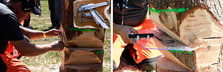 A bírók mindent mérnek, hogy megítélhesség az elvégzett munka pontosságát. A döntésnél ez különösen speciális, hiszen a versenyzők nem tényleges élő fákat döntenek, hanem az ezeket imitáló rönkökön végzik el a döntővágást, aminek pontosságát speciálisan átalakított tolómérővel és plexilapra szerelt lézer-irányjelzővel lehetett mérni.