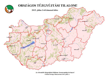 A földművelésügyi miniszter 2015. július 3-án általános tűzgyújtási tilalmat rendelt el, amely azóta is érvényben van. A rendkívül száraz erdők, mezők, mezőgazdasági területek és a meleg, valamint a szeles időjárás miatt gyorsan továbbterjedhetnek a lángok. Fél óra alatt akár tízezerszeresére nőhet egy négyzetméternyi avartűz. Ismételten felhívjuk a figyelmet arra, hogy a járművekből kidobott cigarettacsikktől, de még az eldobott gyufaszáltól is lángra kaphat a kiszáradt vegetáció. Arra kérjük a lakosságot, főként a mezőgazdasági területeken és erdőben dolgozókat, az erdőben kirándulókat, valamint a közúton és vasúton utazókat, hogy fokozottan ügyeljenek a kötelező tűzmegelőzési és karbantartási szabályok betartására. Az erdőkben, fásításokban, valamint azok 200 méteres körzetén belül továbbra is tilos tüzet gyújtani, még kijelölt tűzrakó helyeken sem engedélyezett! Belterületi ingatlanokon körültekintően és megfelelő mennyiségű oltóanyaggal (víz) ellátva grillezzenek, s lehetőleg minél kisebb tüzet rakjanak. A tűzgyújtási tilalom visszavonásig érvényes. Az aktuális tűzgyújtási tilalmakról valamint az erdőtűz megelőzéssel kapcsolatos hasznos tudnivalókról a www.erdotuz.hu oldalon tájékozódhatnak.