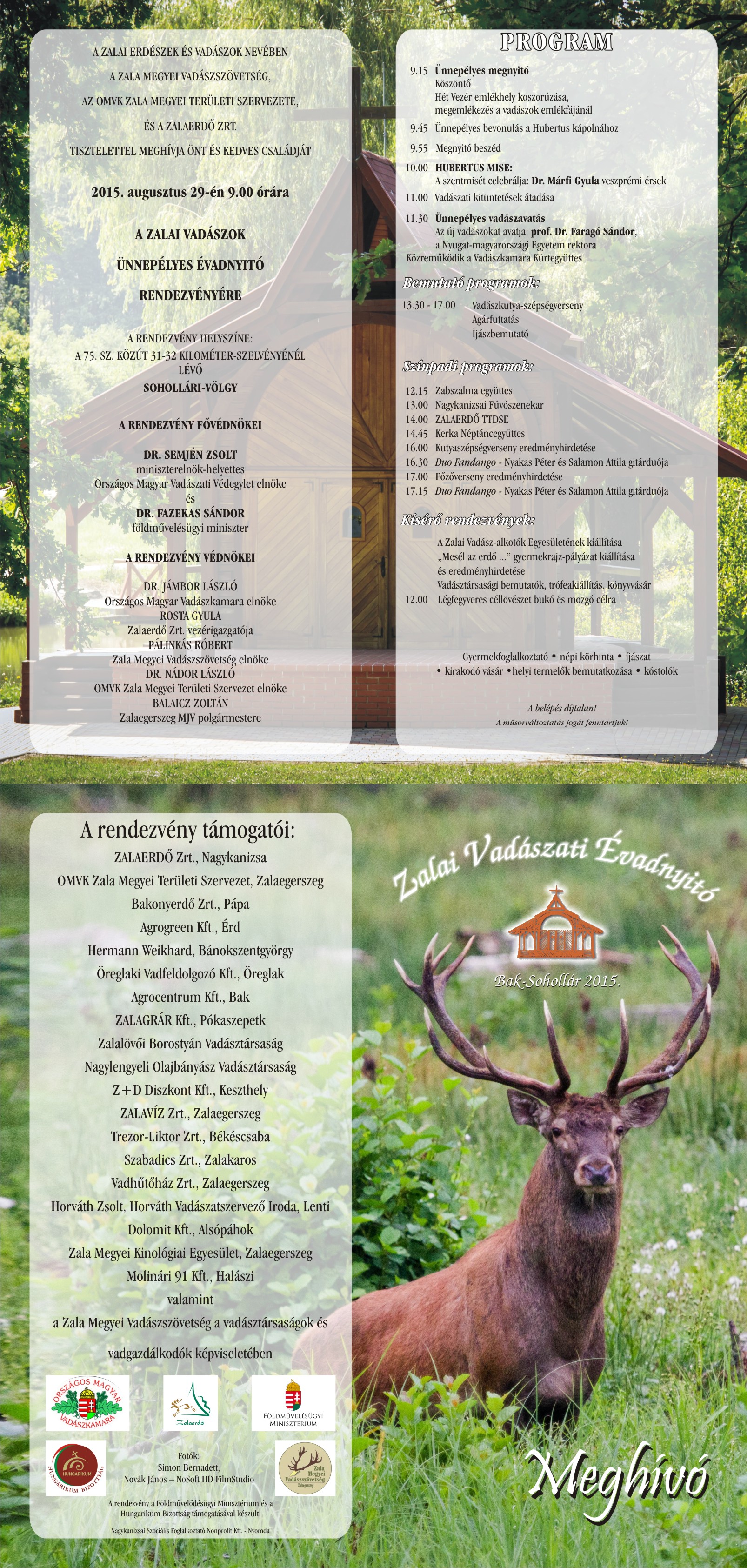 A RENDEZVÉNY TÁMOGATÓI: Zalaerdő Zrt., Nagykanizsa; OMVK Zala megyei Területi Szervezet, Zalaegerszeg; Bakonyerdő Zrt., Pápa; Agrogreen Kft., Érd ; Hermann Weikhard, Bánokszentgyörgy; Öreglaki Vadfeldolgozó Kft., Öreglak; Agrocentrum Kft., Bak; ZALAGRÁR Kft., Pókaszepetk; Zalalövői Borostyán Vadásztársaság; Z+D Diszkont Kft., Keszthely; ZALAVÍZ Zrt., Zalaegerszeg; Trezor-Liktor Zrt., Békéscsaba; Szabadics Zrt., Zalakaros; Vadhűtőház Zrt., Zalaegerszeg; Horváth Zsolt, Horváth Vadászatszervező Iroda, Lenti; Dolomit Kft., Alsópáhok; M&A Hungary Kft., Zalaegerszeg; Molinári 91 Kft., Halászi