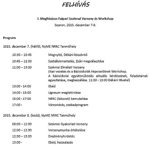 Az NYME Simonyi Károly Kara 2015. november 30. - december 4. között Faipari Szakmai Hetet szervez + I. Meghívásos Szakmai Versenyt és Workshopot rendez december 7-8-án.