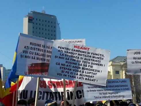 A romániai fakitermelőket tömörítő szövetség által szervezett megmozdulásra az ország minden részéből érkeztek résztvevők, akik a magasba tartott táblákon többek között arra hívták fel a figyelmet, hogy a drágítás miatt csődközeli állapotba kerültek, illetve azt követelték, hogy a Romsilva támogassa a kis- és közepes vállalkozásokat, valamint átlátható, nyílt liciteket szervezzen.