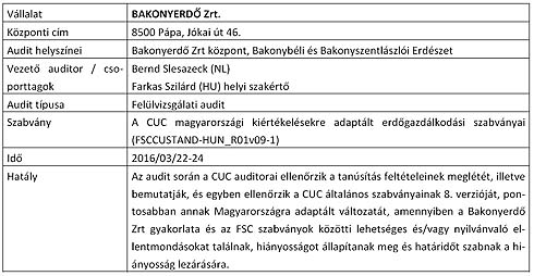 A Control Union Certifications (CUC) ezúton közzéteszi, hogy tanúsító auditot folytat a CUC magyarországi kiértékelésekre adaptált erdőgazdálkodási szabványai (a FSCCUSTAND-HUN_R01v09-1) alapján. Ez a szabvány erről a linkről megnyitható.