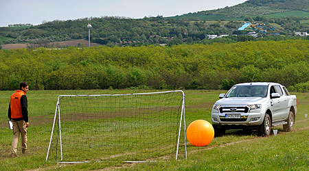 Kihajtva a mogyoródi versenypálya területéről, onnét nem messze kellett megtalálnunk a "focipályát", ahol az autó orrával kellett kapura lőni 10-szer. Két elvetélt kísérlet után a többi 8-at sikerült a kapuba juttatnom, tehát nagyon gyorsan rá letett érezni, hogy az autó jelentős tömegét hogyan is kell hirtelen felgyorsítani a jelölt helytől, majd a földes terepen hasonlóan hamar megállítani, hogy a jelen ne csússzon túl. Meg persze az irány is jó legyen a gólokhoz.