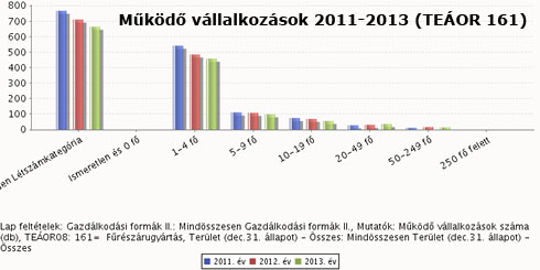 A tárgyévi összesített árbevételük 13,42%-os növekedést mutat az előző évhez képest. A csoport tevékenysége hatékonyságát jellemzi, hogy az összesített üzemi eredmény 3,421 milliárd forint volt (2013: 2,457 milliárd Ft), ami árbevétel-arányosan 5,91%-ot tesz ki (2013: 4,81%). A cégek tevékenységük során az árbevételhez viszonyítva átlagosan 78,73%-os anyagköltséggel (2013: 78,64%) és 11,87%-os bérköltséggel (2013: 12,34%) működtek. Mindösszesen 3350 főt foglalkoztattak az adott időszakban (2013: 3175 fő). Az üzemi eredmény 13 cégnél volt negatív (=veszteséges a fűrészáru gyártás), a mérleg szerinti eredmény viszont csak 10 vállalkozásnál mutat tényleges tárgyévi veszteséget. A cégek tulajdonosai 2014-ben 537,8 millió Ft összeget írtak elő osztalékra. Módszertan: Az adatforrások: cégek által készített mérlegek, eredménykimutatások adatsorai, a 22 éve üzemelő FATUDAKOZÓnk cégadatbázisa, az Igazságügyi Minisztérium elektronikus-beszámolókat közvetítő online rendszere, a nyilvánosan hozzáférhető cégbírósági adatokat online közvetítő OPTEN rendszere, a Nemzeti Cégtár, valamint a CompLex Céginfo adatbázisa. Különböző adatforrásokból adatot gyűjtöttünk, hogy az állami statisztika szerint hány fűrészáru gyártó lehet. A cégbíróságok közel 40 ezer olyan céget tartanak nyilván, amelyek fő, vagy valahanyadik altevékenységüknek ezt megjelölték. Ebből valamivel több mint 15 ezer számít rendben működőnek, melyek közül 930-nál volt megjelölve főtevékenységnek a fűrészáru gyártás 2014. december 31-én. A KSH regisztrált és működő fűrészárugyártókat tart nyilván, melyek idősora az alábbiak szerinti csökkenő tendenciát mutatja.