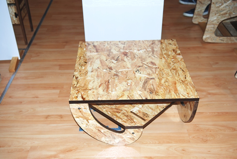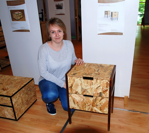 Csoma Sarolta, harmadéves Ipari Termék- és Formatervező mérnök-hallgató három különböző koncepciót készített az OSB lapok felhasználására, végül konzulensével a legelegánsabb, legtöbb kihívást jelentő bútortervet választották, így készült el a kiállított éjjeliszekrény. A tervezés és kivitelezés legnagyobb kihívása annak megoldása volt, hogy hogyan lehet az általában fémből készülő fiókcsúszót is tömör fából elkészíteni. "Élveztem a tervezést és a gyártást is. Amikor eljön az ideje, belső építészettel, bútortervezéssel szeretnék foglalkozni, akár saját vállalkozás keretében is. A lényeg, hogy azt csinálhassam, amit szeretek - ehhez a szakon megkapok minden tudást, és kiélhetem a kreativitásomat úgy, hogy nem érzem nyűgnek a tanulást." - mondta a végzős mérnök-hallgató. fotók: Bucsy Gyöngyvér, szöveg: Iszak Noémi - NymE
