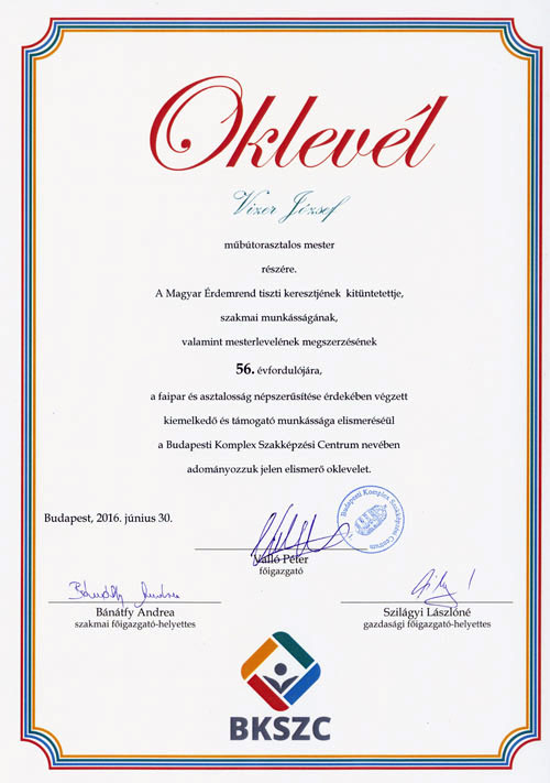 Az átadó keretein belül a Centrum elismerő oklevéllel tüntette ki Vizer József műbútorasztalos mestert az oktatásban nyújtott sok éves szakmai munkájára, illetve szakmai jubileumára való tekintettel. (Az oklevélre kattintva az nagyítható.) A díjakat és okleveleket Valló Péter, a Centrum főigazgatójának társaságában Bánátfy Andrea (a Szakképzési Centrum szakmai főigazgató-helyettese) és Vizer József adták át.
