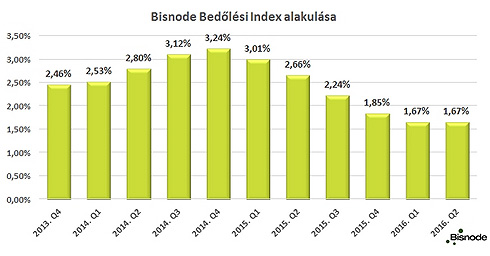 A csődök és felszámolások számának mérséklődésének köszönhetően a Bisnode Bedőlési Index (BBI) értéke is csökken. Ez a mutatószám az elmúlt 12 hónapban indított csőd és felszámolási eljárások számát viszonyítja a hazánkban működő cégek számához. Bár a működő cégek száma még mindig csökkenést mutat, a nemfizetési eljárások számában megfigyelhető visszaesésnek köszönhetően a BBI értéke közel egy százalékkal mérséklődött az elmúlt évben. A legnagyobb bedőlési arány 2014 végén jellemezte a cégeket, akkor a mostani szint közel kétszeresét, 3,24 százalékot mértünk, - emeli ki Keleti József a Bisnode cégcsoport Country Managere - ám 2014 végétől a bedőlési index értékében folyamatos csökkenés tapasztalható.