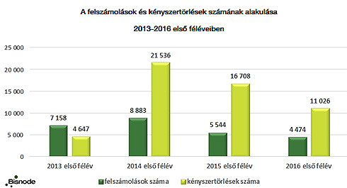 Az év első hat hónapjában tovább csökkent a felszámolások és a kényszertörlések száma Magyarországon. Míg a tavalyi év azonos időszakában a felszámolások aránya 37,6 százalékkal csökkent a 2014-es bázishoz képest, addig az idei év első felében a csökkenés mértéke közel a felére - 19,3 százalékra - esett vissza. Mindezek mellett a kényszertörlések száma tovább csökkent, hiszen míg a a 2014-es - több, mint 42,5 ezres - csúcsról 2015-re 22,42 százalékkal esett, addig 2015-ről 2016 első félévére már 34 százalékos mérséklődést tapasztalhattunk.