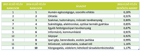 Jó hír továbbá, hogy minden szektorban csökkent kisebb-nagyobb mértékben a kockázatosság. A legalacsonyabb 0,1 százalékpontos csökkenés a humán-egészségügyet jellemezte, ám ezen a területen már korábban is olyan alacsony volt a bedőlési arány, hogy még így is nagy fölénnyel őrizte meg első helyét a legmegbízhatóbb ágazatok sorában. A második legmegbízhatóbb ágazat továbbra is az oktatás, ám az ipari gépek és berendezések javításával foglalkozó ágazat a korábbi harmadikról a nyolcadik helyre esett vissza, mivel csak minimálisan tudta tovább csökkenteni kockázatosságát. Tavalyhoz képest a legjobb tíz ágazat közé került a gépipar, illetve a művészet, szórakoztatás és szabadidő is.