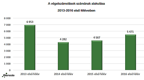 Az elmúlt évek első féléves adatait vizsgálva már 2014-ről 2015-re is látható egy 6,7 százalékos növekedés, ám a teljes éves adatokat vizsgálva ezzel a növekedéssel már nem találkozunk, hiszen 2014-ben 7 911, míg 2015-ben mindössze 7 865 végelszámolás indult. (A legtöbb végelszámolást a válság idején kezdeményeztek, számuk 2012-ben évi több mint 27 ezer új eljárással tetőzött.)