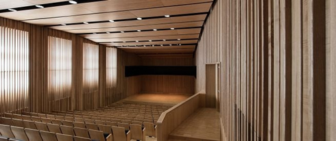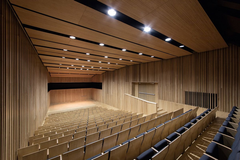 A terem tervezésekor fontos szempont volt a színvonalas teremakusztika, a magas minőségű és egyenletes beszédérthetőség létrejötte előadások és prezentációk alkalmával, de a tér különösen alkalmas kisléptékű kamarazenekari koncertek befogadására is. A kamarazenéhez szükséges megfelelően nagy belmagasságot a korábbi tornaterem mélyítésével lehetett elérni. A tér utózengési idejének optimális értékét döntően a terem térfogata, formája és arányai határozzák meg. Az ellenőrző mérések alapján a megvalósult teremben a frekvenciafüggő utózengési idő a teljes hallható tartományban kiemelkedően egyenletes és a lecsengés módja is ideális. A terem kiváló hangzásának fontos összetevője továbbá a tér magas diffuzitása, melyet az egyedileg tervezett kőrisfa burkolatok biztosítanak. Az egyenletes hangenergia-ellátást segítik továbbá a sávos bükk mennyezeti hangvetők, a tér oldalfalainak megtört kialakítása, a reflektor, diffuzor és hangelnyelő felületek optimalizálása, a beépített membrán felületek és a gondosan megtervezett zsöllyeszékek. A fellépő diákok és művészek harmonikus akusztikai környezetét a színpad egyedi rétegfelépítése is szolgálja, a padozatok egységesen tölgy anyagúak.