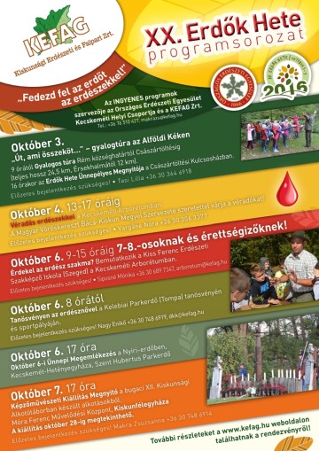Október 6. csütörtök 8 órától Tanösvényen az erdésznővel a Kelebiai Parkerdő (Tompa, Dél-Kiskunsági Erdészet) tanösvényén és sportpályáján. Bebarangoljuk a parkerdőt, megismerkedünk minden élővel és élettelennel, ami az utunk során elénk tárul. Mindez sok játékkal, mozgással! Előzetes bejelentkezés szükséges! Nagy Enikő +36 30 748 6919, dkk@kefag.hu