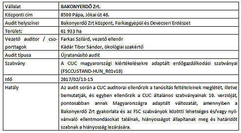 A Control Union Certifications (CUC) ezúton közzéteszi, hogy tanúsító auditot folytat a CUC magyarországi kiértékelésekre adaptált erdőgazdálkodási szabványai (a FSCCUSTAND-HUN_R01v10) alapján. A szabványt kérésre megküldjük.