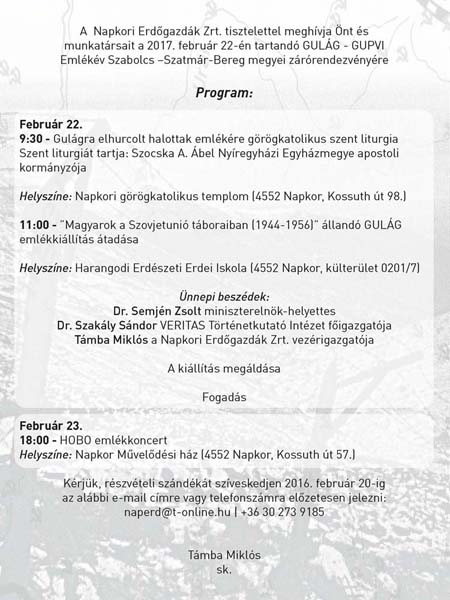 A Napkori Erdőgazdák Zrt. tisztelettel meghívja Önt és munkatársait a 2017. február 22-én tartandó GULÁG - GUPVI Emlékév Szabolcs-Szatmár-Bereg megyei zárórendezvényére.