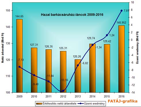 A FATÁJ elemzése szerint a magyarországi barkácsáruház-láncok csoportja (korábban 6, tavaly már csak 5 vállalkozás) 2016-ban 140,952 milliárd forint árbevételt realizált (2015: 129,418 Mrd Ft; 2014: 129,735 Mrd Ft; 2013: 120,256 Mrd Ft; 2012: 125,308 Mrd Ft, 2011: 126,351 Mrd Ft, 2010: 127,313 Mrd Ft; 2009: 144,652 Mrd Ft).