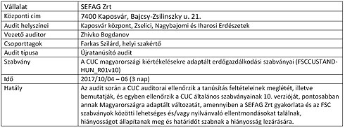 A Control Union Certifications (CUC) ezúton közzéteszi, hogy tanúsító auditot folytat a CUC magyarországi kiértékelésekre adaptált erdőgazdálkodási szabványai (a FSCCUSTAND-HUN_R01v10) alapján. A szabványt kérésre megküldjük.