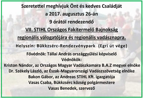 Szeretettel meghívjuk Önt és kedves Családját a 2017. augusztus 26-án 9 órától rendezendő VII. Stihl Országos Fakitermelő Bajnokság regionális válogatójára ér regionális vadásznapra. |