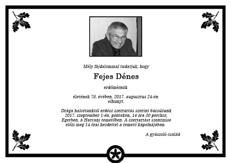Mély fájdalommal tudatjuk, hogy Fejes Dénes erdőmérnök, az EGERERDŐ Zrt., nyugalmazott termelési vezérigazgató-helyettese életének 78. évében elhunyt.