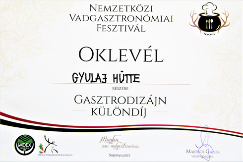 A főzőverseny sajátossága, hogy "zsákbamacska" jelleggel kapott vadhúsból kell főzni, azaz a csapatok a helyszínen tudják meg egy meglepetés csomag átvétele után, hogy milyen vadhúsból kell elkészíteniük egy bográcsos egytál ételt. A sorsolást követően a Gyulaj Hütte csapata szarvashúsból főzött ízletes vargányás vadpörköltet, melyhez kapros nokedlit tálaltak. A 'szabadon választott' vadétel kategóriában zöldségágyon párolt, aszalt szilvás szósszal körített, tűzdelt vaddisznógerincet készítettek és kínáltak. A vadételek kategóriánként történő zsűrizése mellett a csapatok tálalási megjelenését és az esztétikai összhatását is díjazták az un. "Gasztordizájn Különdíjjal", ahhoz pedig komoly előkészületekre volt szükség, hogy egy igazi alpesi Jagdhütte hangulat kialakuljon a feltálalt ételek köré, mindezt a verseny körülmények között, szintidőre. Nagy örömünkre a különdíjat a "Gyulaj Hütte" tagjai vehették át.