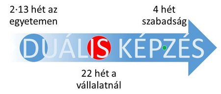 Milyen a duális képzés? A duális képzés nem más, mint az egyetemi képzés és a vele párhuzamosan folyó szakmai gyakorlati képzés, melynek célja, hogy a hallgatóink tapasztalt szakemberek iránymutatásai alapján megismerkedhessenek leendő szakmájuk gyakorlati kérdéseivel. A hallgatóknak vállalati tartózkodásuk alatt lehetőségük nyílik elméleti tudásuk gyakorlati tudássá történő elmélyítésére, mely így sokkal komplexebb ismeretet biztosít számukra (technológia megismerése, kreativitás, felelősségvállalás, csapatmunka, szakmai nyelv, stb.), készség szintre fejleszti elméleti tudásuk alkalmazását. Egy évet tekintve a hallgató 26 hetet az egyetemen, míg 22 hetet vállalatnál tölt. A duális képzésben az alapképzéstől eltérően a páratlan (őszi) félévek 6-8 hétből, míg a páros (tavaszi) félévek 14-16 hétből állnak.