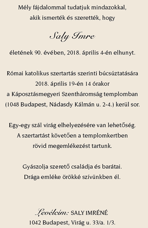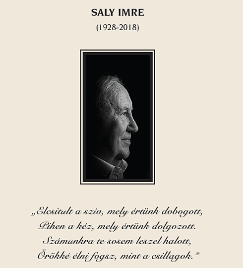 Mély fájdalommal tudatjuk mindazokkal, akik ismerték és szerették, hogy Saly Imre, a BUBIV (Budapesti Bútoripari Vállalat) nyugalmazott vezérigazgató-helyettese, életének 90. évében, 2018. április 4-én elhunyt. |