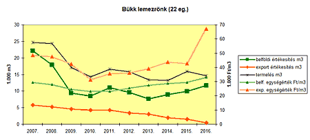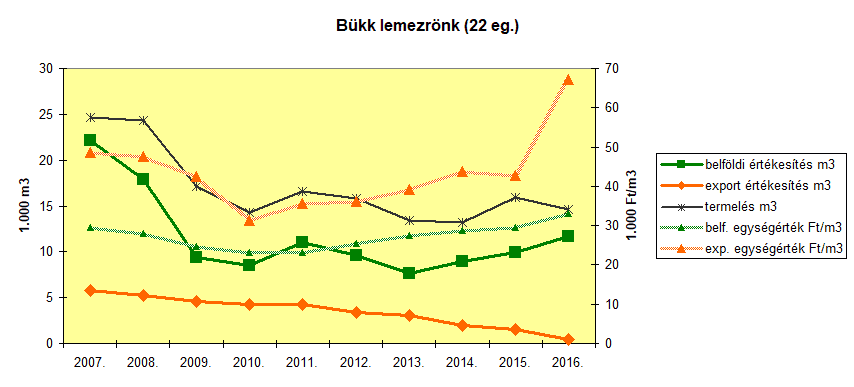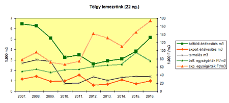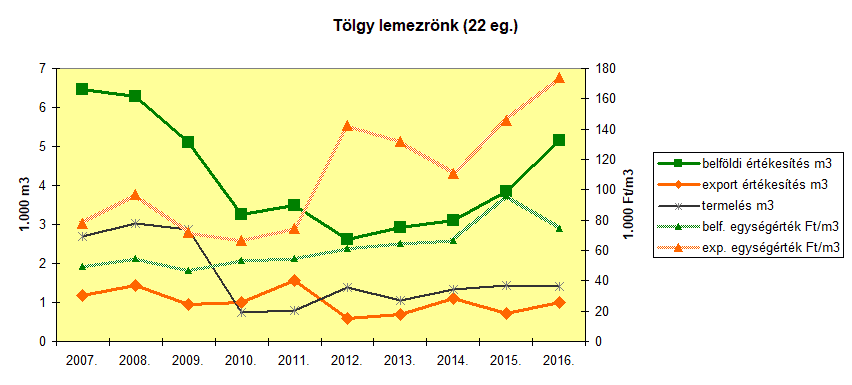 Az erdei fatermékek termelése és készletváltozása (OSAP 1259) adatközlés, illetve az ebből készülő idősor az állam tulajdonában álló erdőgazdasági zrt-k által, a saját gazdálkodási területükön kitermelt vagy bérmunkában kitermeltetett faanyagból származó fontosabb erdei fatermékek éves nyitókészletét, termelését, beszerzését, felhasználását, értékesítését (belf/exp) és az értékesítésből származó árbevételt (belf/exp) mutatja. Rengeteg sok szám. A 2007-2016. évekre a teljes fenti adatsor bárki részére nyilvánosan rendelkezésre áll. Ugyanakkor gratulálni fogok annak, aki megtalálja, hogy hol. (Akik részt vettek a vonatkozó minapi értekezleten, nekik nem ér súgni a többieknek. :-) ) Nos, essünk neki, mit lehet ebből kihámozni. Vegyük elsőre a legelső két sort, a tölgy és bükk lemezrönköt. Ha lesz rá elég energia, apránként majd a többi is sorra kerül. Nyilván a mennyiségi adatok is érdekesek, azonban ez az egyetlen olyan lap, amin az értékesítés árbevétele is szerepel, s így számítható az egységérték. Igaz, ez nem ár: a konkrét tételeknek, daraboknak van ára, de a 22 cég összesenjére számított egységérték is mutat valamit. A táblázatok sok adatát egyszerre idősorban mutatni nem lehetne még egy-egy választéknál sem, így kiragadtam a termelés és értékesítési adatokat.
