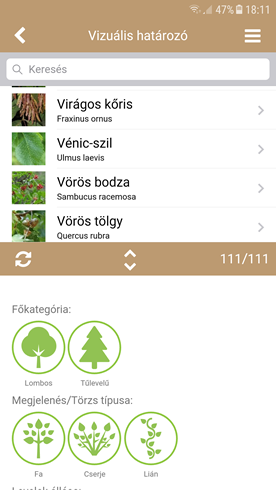 A növényhatározóban a vizuális meghatározás funkciót választva egyszerű ikonok segítik a határozás folyamatát: az előttünk álló növény egy-egy ismérve alapján tudjuk szűkíteni a találati számot, míg el nem jutunk a keresett fajhoz, ahol már fotók segítik a pontos azonosítást. A törzs vagy a levél alakja, a virág színe és a virágzás ideje, a termés állaga vagy színe mind-mind hasznos információt adnak egy-egy fajról, és megfigyelésükkel segítenek a növény felismerésében. A letöltött és telepített alkalmazás ráadásul a terepen offline, kikapcsolt mobilhálózattal is használható, így csak az akkumulátor töltöttségére kell figyelnünk, ha a kirándulás során meg akarjuk ismerni a minket körülvevő fákat.