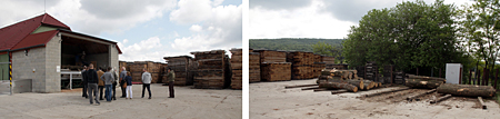 A rönktér ahol az évi 1-2 ezer m3 közötti feldolgozáshoz a rönköt tárolják és a felvágás előtt korszerű félautomata kérgező géppel (bal oldali kép) lekérgezik.