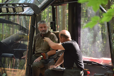 A legkényesebb pont - a gépkezelő személye Az érdeklődőket Bodor Csaba, gépkezelő, vezette be a harvester műhelytitkaiba, a gyakorlat során szerzett tapasztalataiból mondott el érdekességeket. Kiemelte, a gépkezelővel szemben alapvető elvárás, hogy képes legyen a folyamatos figyelem-megosztásra, jól tűrje a monotonitást és az egyedüllétet. Fontos, hogy tudjon önálló döntéseket hozni, és a helyszínen megoldást keresni műszaki vagy egyéb szakmai problémákra. Érdekességként megemlítette: egy svéd felmérés szerint, a harvester-kezelőnek több döntést kell hoznia adott idő egység alatt, mint egy vadászgép pilótának. "Fontos, hogy a kezelő szeresse az erdőt, és magát a gépet is. Legyen igényes a munkájára, hiszen a harvester csak hozzáértő kezekben hozza az elvárt teljesítményt, és lesz az erdész méltó társa a munkájában." - hangsúlyozta. A technológia nélkülözhetetlen része a kihordó is, ezért a harvester kezelőjének a faanyag termelése során szem előtt kell tartania a közelítés hatékonyságát is. A jövő a legmodernebb technológiával felszerelt, flottában dolgozó gépsoroké, amelyek a terepviszonyoknak és a megtermelt választékoknak a figyelembe vételével optimalizálni képesek a forwarder térbeli mozgását.