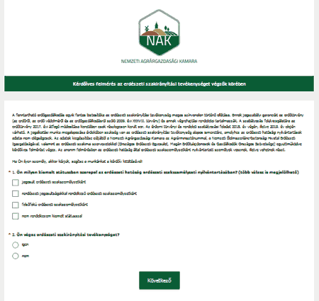 A fenntartható erdőgazdálkodás egyik fontos biztosítéka az erdészeti szakirányítási tevékenység magas színvonalon ellátása. Ennek jogszabályi garanciáit az erdőtörvény és annak végrehajtási rendeletei tartalmazzák. A hatályos szabályozás folyamatban lévő felülvizsgálatának, és szükség szerinti módosításának megalapozása érdekében szükség van az erdészeti szakirányítási gyakorlat, illetve az erdészeti szakszemélyzet tapasztalatainak és javaslatainak az alapos ismeretére. Ennek érdekében a Nemzeti Agrárgazdasági Kamara az Agrárminisztériummal, a Nemzeti Élelmiszerlánc-biztonsági Hivatal Erdészeti Igazgatóságával, valamint az erdészeti szakmai szervezetekkel (Országos Erdészeti Egyesület, Magán Erdőtulajdonosok és Gazdálkodók Országos Szövetsége) együttműködve a 2018. december 15-ig tartó időszakban anonim online kérdőíves felmérést végez az erdészeti hatóság által erdészeti szakszemélyzetként nyilvántartott személyek körében.