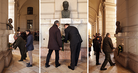 Az ünnepi emlékezések után a minisztérium árkádsorán Zambó Péter elnök és dr. Bitay Márton államtitkár megkoszorúzta kálnoki Bedő Albert mellszobrát. Kiss László általános alelnök és prof. dr. Náhlik András rektor (SOE) Wagner Károly, míg Andrésiné dr. Ambrus Ildikó és prof. dr. Bidló András dékán (SOE EMK) Kaán Károly szobrainál helyezték el a tisztelet koszorúit.