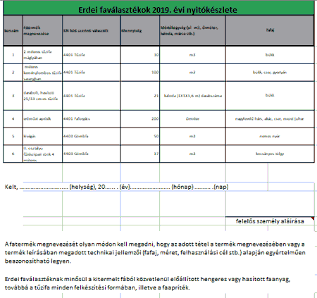 A nyitó készletet fafajonként, választékonként telephelyenkénti bontásban kell megadni. A készletadatokat nem kell a NÉBIH-hez beküldeni, de az a faanyag kereskedelmi lánc szereplő nyomon követhetőséget biztosító nyilvántartásának részét képezi, a telephelyen így rendelkezésre kell állnia. A faanyag kereskedelmi lánchoz tartozó tevékenység tekintetében telephelynek minősül az a hely, ahol a faanyag kereskedelmi lánchoz tartozó tevékenységet folytatják, így különösen az állandó vagy rendszeres üzleti (üzemi), termelő és szolgáltató tevékenység helye. Erdőrészletet vagy erdőgazdálkodási tevékenységet közvetlenül szolgáló földterületet nem kell telephelyként bejelenteni, amennyiben az oda bejegyzett erdőgazdálkodó folytat rajta faanyag kereskedelmi lánchoz tartozó tevékenységet, de annak nyilvántartott készletét az erdőgazdálkodó összes készletében szerepeltetni szükséges. Az üzleti év elejére vonatkozó nyilvántartási kötelezettség már 2018. évben is fennállt, de a fokozatosság elvét követve 2018-ban ennek hiánya miatt nem szankcionáltak az ellenőrök. A 2019. évi ellenőrzések során az üzleti év elejére vonatkozó nyilvántartási kötelezettség teljesítését a NÉBIH már kiemelten vizsgálja. A telephelyi ellenőrzések tapasztalatai alapján mind az ellenőrzött láncszereplők, mind a hatóság munkáját megkönnyítette a nyitókészletek rendelkezésre állása. Ezen egyszerű példán keresztül szemléltetjük egy telephely erdei faválasztékaira vonatkozóan a 2019. évi nyitókészlet lehetséges nyilvántartási elemeit. A minta táblázat előnézeti képe (rákattintva Excelben megnyittható):
