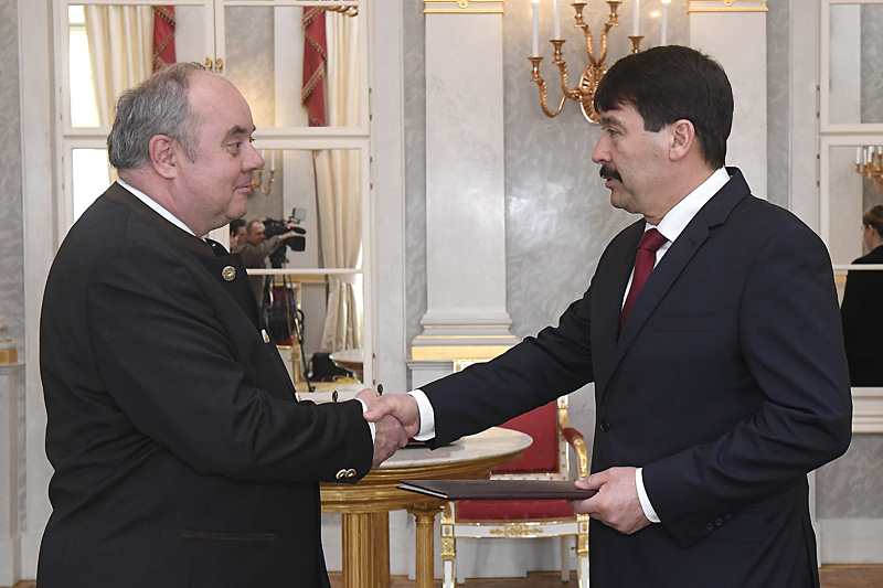 Zambó Péter, az Agrárminisztérium államtitkára (b) átveszi kinevezési okmányát Áder János köztársasági elnöktől a Sándor-palotában 2019. február 18-án. MTI/Kovács Tamás