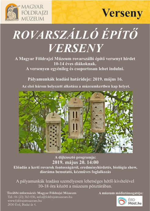 A pályamunkák leadási határideje 2019. május 16., Magyar Földrajzi Múzeum pénztára (2030 Érd, Budai út 4.) - a rovarszállón kérjük, tüntessétek fel a készítő nevét, életkorát, illetve telefonszámát és e-mail címét.