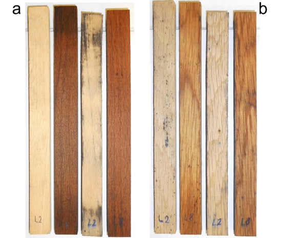 1. ábra. Kezeletlen (világos színű) és tejsavval kezelt (sötét színű) bükk (a) és tölgy (b) minták. Először a tömörítetlen párok, majd a hosszirányban tömörítettek láthatók.