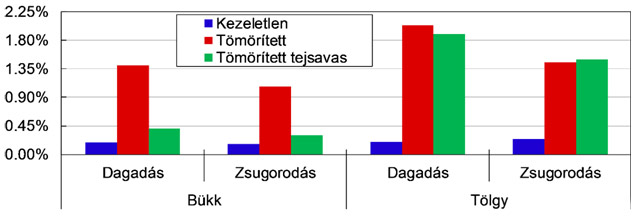Míg a bükk minták teljes keresztmetszetben telítődtek, addig a tölgy minták telítése sikertelen volt, csupán a felületükre rakódott a tejsav-oligomerből. Ez a jelenség tipikus a nagymértékben tíliszesedő fafajokra. A telítés hatására bekövetkezett teljes tömegnövekedés tömörítetlen bükkfa esetében 73%, míg tömörített bükkfa esetében 64% volt. A faanyag mérete vízzel telítés során növekszik, bükk esetében a legnagyobb átlagos növekedés a három fő anatómiai irányban (R, T, L) rendre 4,4%, 10,9% és 0,2%. A nagymértékű tejsavfelvétel hatására a tömörítetlen faanyag méretei a vízzel telítéshez hasonló mértékben növekedtek, 4,6% 13,5% és 0,2%-kal, míg a tömörített faanyag 4,9% 13,6% és 1,1%-kal. Természetesen a faanyag sűrűsége is jelentősen magasabb lett: tömörítetlen faanyag esetén 43%, míg tömörített faanyagnál 36% sűrűségnövekedés következett be, amivel mindkét bükk mintacsoport elérte a 0,94 g/cm3 abszolút száraz sűrűségi értéket. Pásztázó elektronmikroszkóppal vizsgálva megállapítható, hogy a telítő anyagból a bükk faanyag nedvességszállító edényeibe jutott nagyobb mennyiség, de a rostüregekbe is került. A tejsavval telített faanyag érintése ugyan kissé műanyagos hatású, de az optikai javulás mellett ezt a problémát kiküszöböli a felületkezelés, amit szinte minden esetben elvégeznek a késztermékek gyártása során. Az áztatási vizsgálat eredményei közül érdemes kiemelni a hosszirányú méretváltozásokat (2. ábra). A hosszirányban tömörített bükk faanyag hosszirányú dagadása éppúgy töredékére csökkent, mint a hosszirányú zsugorodása. A kezelés tehát elérte célját, a bükk - mint a tömörítésnél leggyakrabban alkalmazott alapanyag - tulajdonságai a céloknak megfelelően jelentősen javultak.