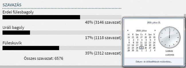 Az olvasók az uráli bagolyra 1118-an szavaztak, a füleskuvikra 2312-en, az erdei fülesbagolyra pedig 3146 szavazat érkezett. Vitathatatlanul ez a kedvenc, a szavazók 48%-a száza nyomta erre a bagolyra a voksot. Az erdei fülesbagoly kicsit olyan, mint ahogyan megismertük dr. Bubót, a kisebb erdőket szereti, megtalálható öreg temetőkben, folyóárterekben. Ez a leggyakoribb haza bagolyfajunk, a telet általában örökzöldeken vészelik át, évente egyszer költenek, márciusban.