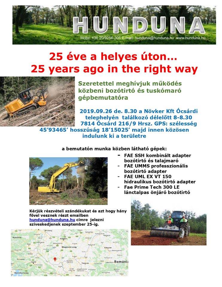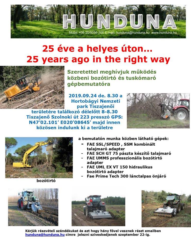 A HUNDUNA a bozótirtót és a tuskómarót működés közben fogja bemutatni. Az alábbi gépek szerepelnek a bemutatókon: