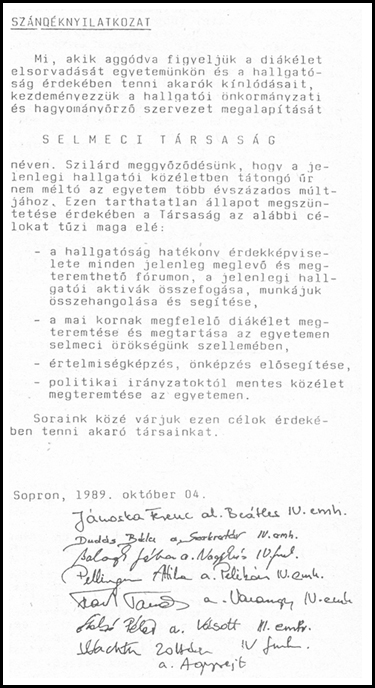 A Selmeci Társaság alapításának Szándéknyilatkozata, 1989-ből.