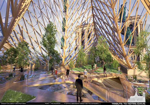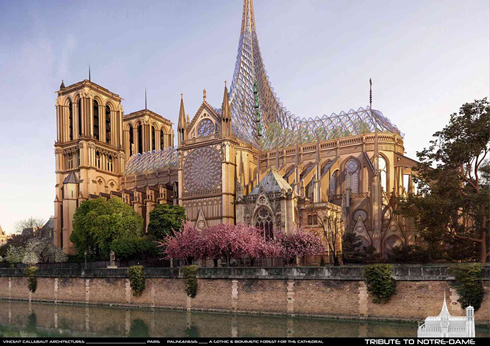 A Palingenesis (görögül újjászületés) névre keresztelt dizájn a főhajót, a tetőt és a templomtornyot egyesíti. Az itt alkalmazott keresztrétegelt fát (CLT) szénszálas anyaggal erősítik meg, az új tölgy vázhoz csatlakozó szerkezet anyaghasználata minimális lenne. A tíz méter magas eredeti padlás megmarad, de a tető 55 fokban hasít majd az ég felé. "Az áthatolhatóság, közösség és nyitottság" szlogenje adott támpontot az új Notre Dame tervezésénél - nyilatkozta a tervező. Az új faszerkezetet borító kristályüveg kupola szekciókra oszlik. A kristályok a beáramló fény hatására az aktív szénből - ami oxigénből, hidrogénből és nitrogénből áll -, energiát hoz létre. Az így nyert energiát hidrogéncellák tárolják, majd továbbítják a székesegyház különböző területeire. Egy szabad szellőzőrendszert is kialakítanak a szerkezetben.