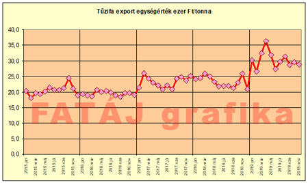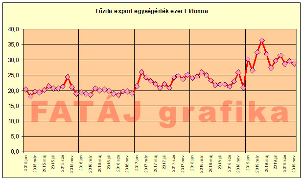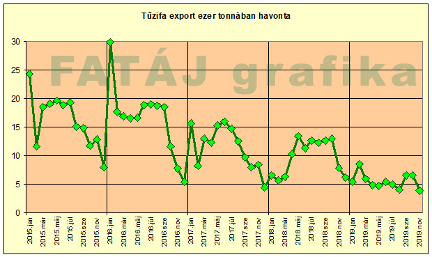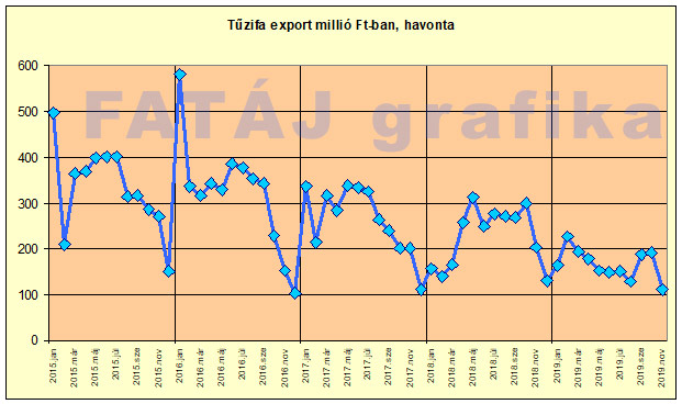 Ha a mennyiséget havi bontásban szemléljük, a tendencia még feltünőbb, illetve így a 2019. novemberig adatok is láthatóak, amiből az derül ki, hogy a tavalyi tűzifa kivitel a tavalyelőttinek mintegy fele lehetett. (Majd hamarosan kiderül az éves összesen is.)